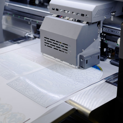 Similar to high end direct to film garment printing an industrial inkjet printer is used to print the design. UV DTF printers first print the white layer on to an adhesive film, then print the colour layer, and finally a clear varnish where on top of that. The machine uses integral ultra bright UV lamps to cure the prints into a super tough yet flexible finished print.